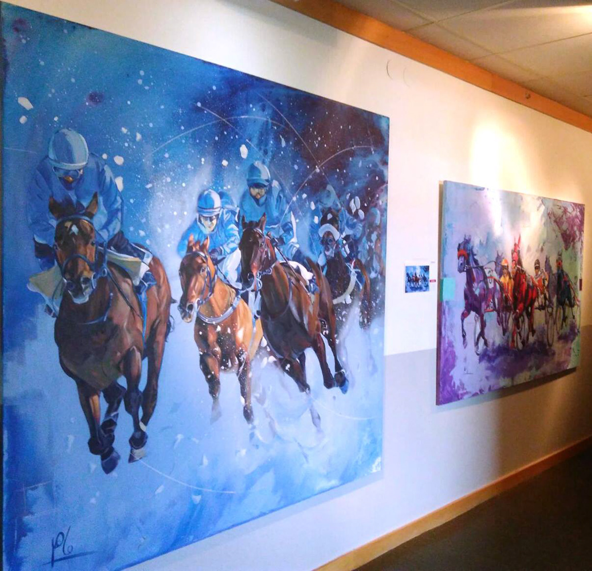 Till utställning har han skapat verk som ligger nära utställningsplatsen - kraftfulla, färgstarka travhästar fångade mitt i steget.