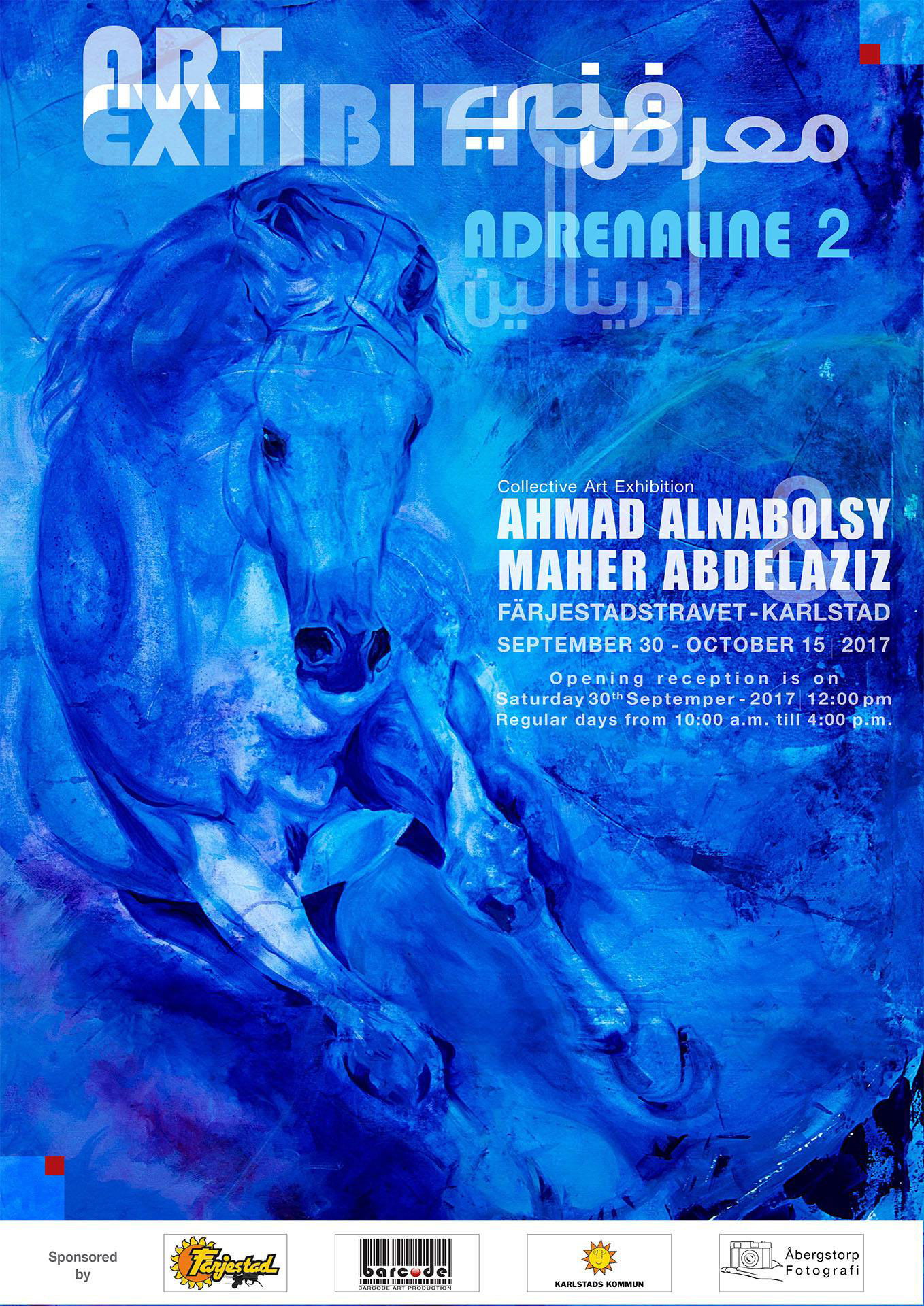 – Konstföreningen Ifö Center Exhibit arbetar med den syriske konstnären och filmskaparen Maher Abdul Aziz. Han är utbildad i Dubai, Damaskus och Chicago. 2013 tvingades han fly Syrien och fann en fristad i Sverige. Mötet med det nya landet har inspirerat Aziz’s utställning “Adrenaline” och hans film “Väntan”. Utställningen låter oss se de för honom exotiska tävlingshästarna i svensk hästsport genom konstnärens öga. Kraften och rörelsen i de stora målningarna är enorm.