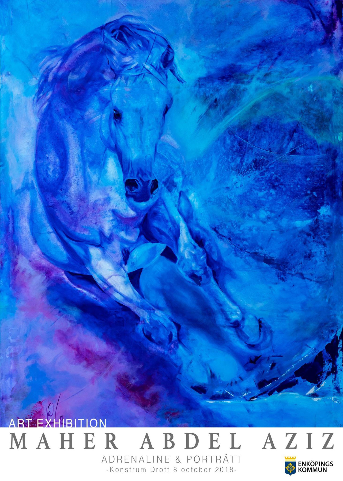 En koloristisk kaskad med motiv från hästar i rörelse och porträtt av kända personer. Maher Abdel Aziz med konstnärlig utbildning från Syrien, Dubai och senast USA har i Sverige bland annat visat sina stora tavlor av hästar i rörelse på Bodentravet, gjort kortfilm om väntan, fotograferat och målat porträtt. Nu visar han tavlor och skulpturer och porträtt av bl.a. Ingmar Bergman och Ingrid Bergman.